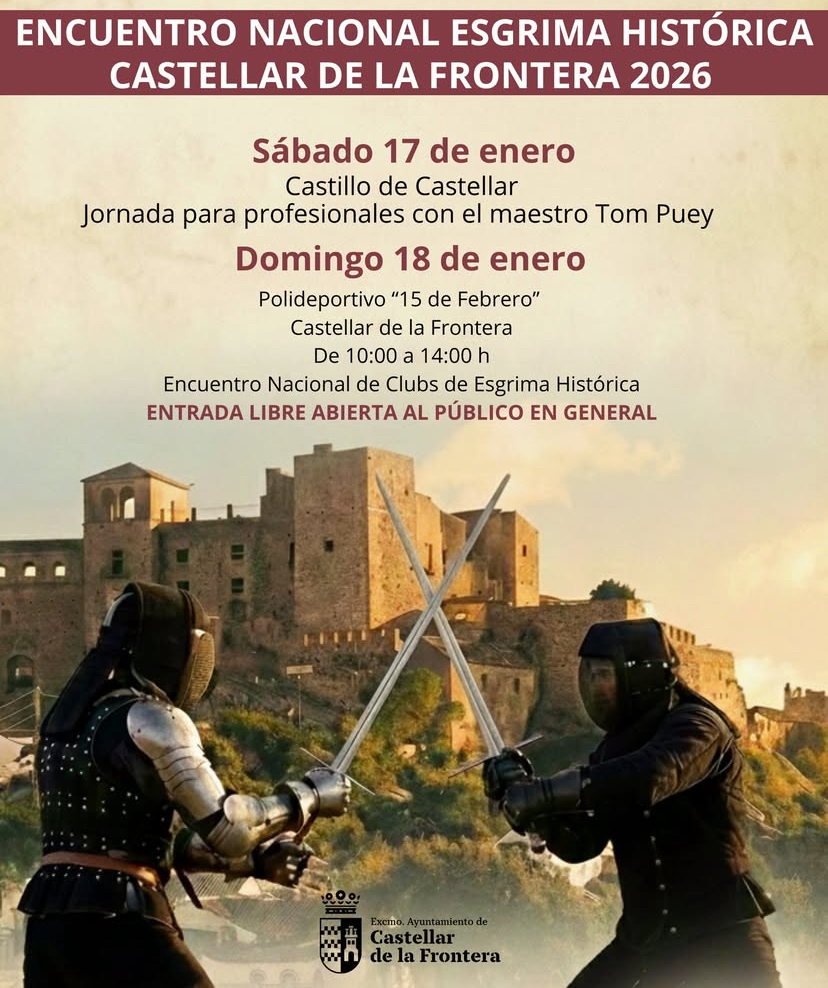 ✨ Castellar de la Frontera se convertirá los próximos 17 y 18 de enero en el centro nacional de la esgrima histórica, reuniendo a especialistas y clubes de todo el país en dos jornadas, una para profesionales y otra abierta al público.