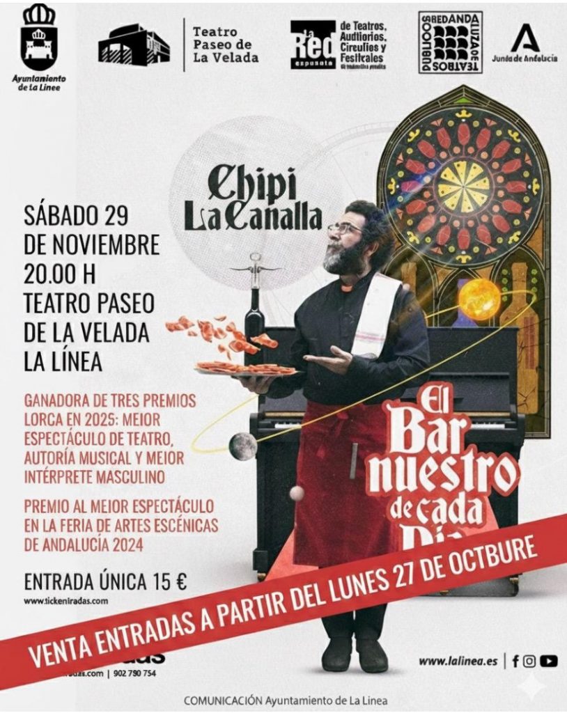 🎭 ‘El Bar nuestro de cada Día’, de Chipi “La Canalla”, reconocida como Mejor Espectáculo de Andalucía 2024 y ganadora de tres Premios Lorca 2025, entre ellos Mejor Obra de Teatro y Mejor Autoría Musical. Un montaje único que mezcla humor, emoción y música para celebrar la vida desde el escenario.