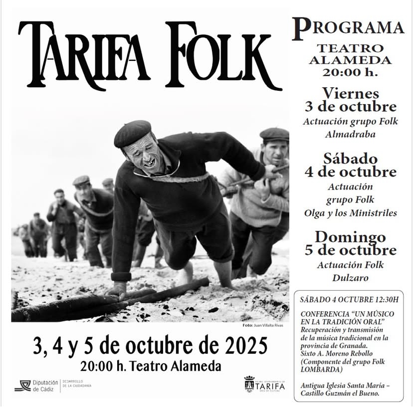 ✅La muestra del 2025 se presenta con un cartel basado en una fotografía del desaparecido Juan Villalta Rivas. Reproduce una antigua estampa tradicional del trabajo de los marineros tarifeños. Cedida por Manuel Rojas, la imagen identifica el valor etnográfico de un grupo, Almadraba, que ha estudiado los cantos del mar, o saloma.