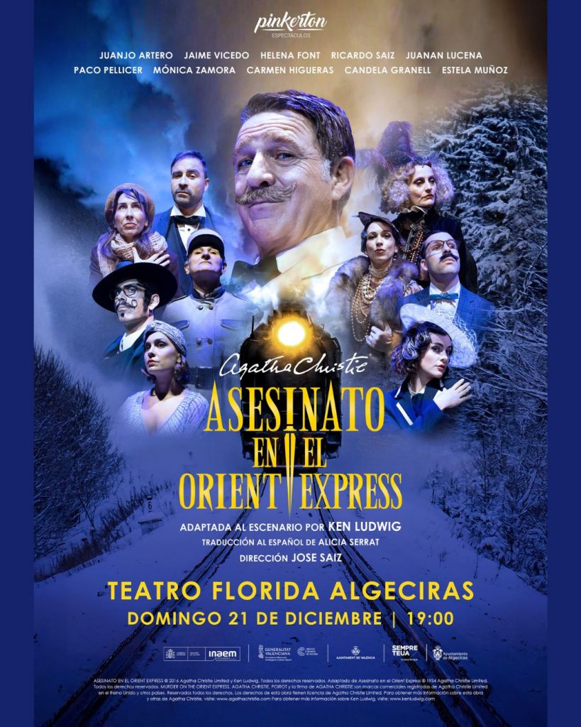 ✨ El clásico inolvidable de Agatha Christie llega al Teatro Florida de Algeciras, ‘Asesinato en el Orient Express’, con adaptación de Ken Ludwig y dirección de José Saiz. Con un gran elenco encabezado por Juanjo Artero, Jaime Vicedo, Helena Font, Ricardo Saiz, Juanan Lucena, Paco Pellicer, Mónica Zamora, Carmen Higueras, Candela Granell y Estela Muñoz. Un espectáculo lleno de intriga, ambientación exquisita y la genialidad de uno de los relatos más célebres de Agatha Christie.