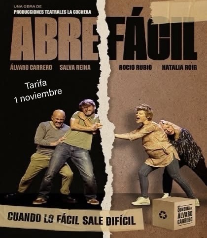 ✨ La comedia ‘Abre fácil’, con el actor malagueño Salva Reina entre su elenco, se presenta este sábado 1 de noviembre en Tarifa. ‘Abre Fácil’ es una comedia teatral del director Álvaro Carrero con un elenco que incluye a Salva Reina, Álvaro Carrero, Rocío Rubio y Natalia Roig. La obra gira en torno a situaciones cotidianas y los giros inesperados de la vida, abordando temas como el arrepentimiento y la dificultad de resolver problemas.